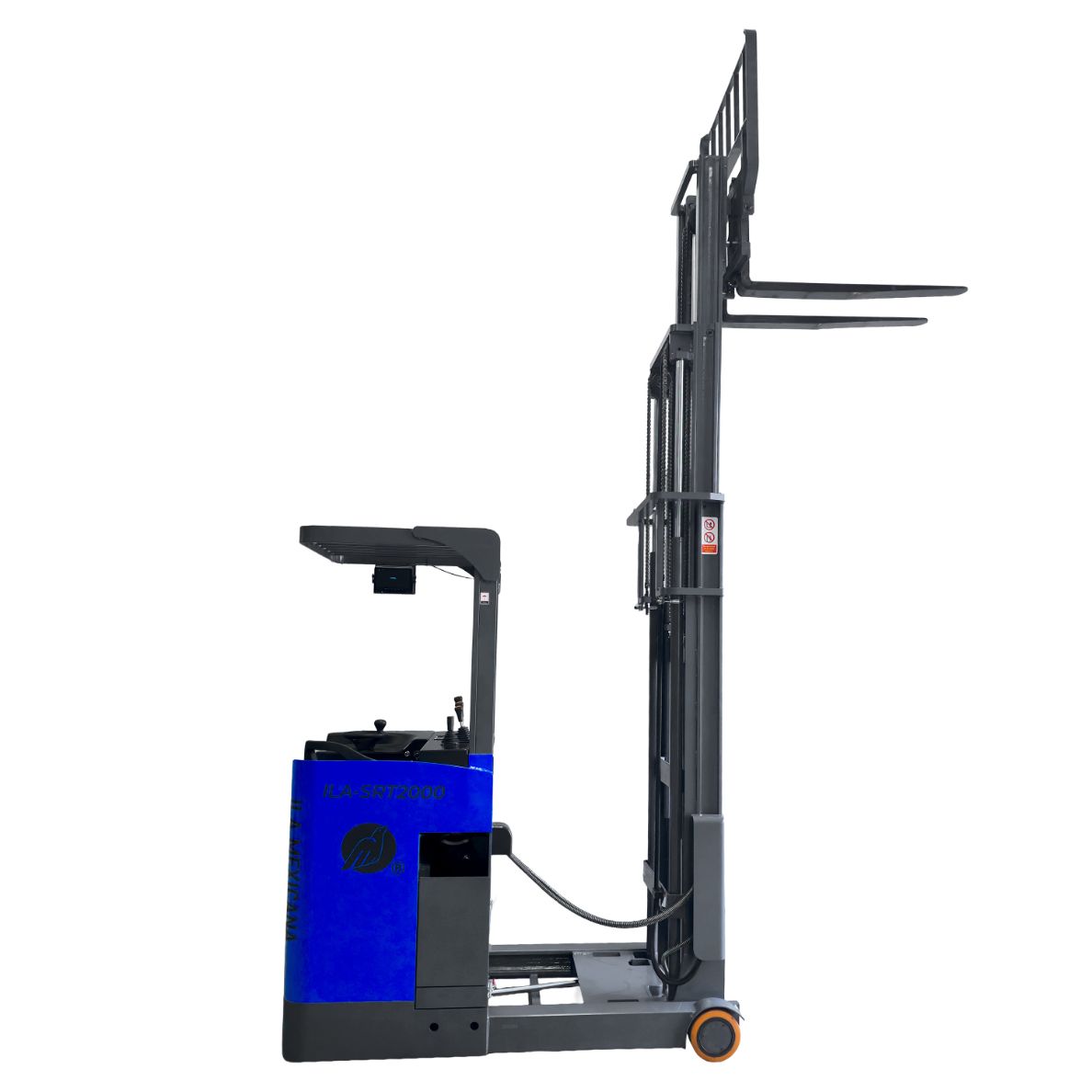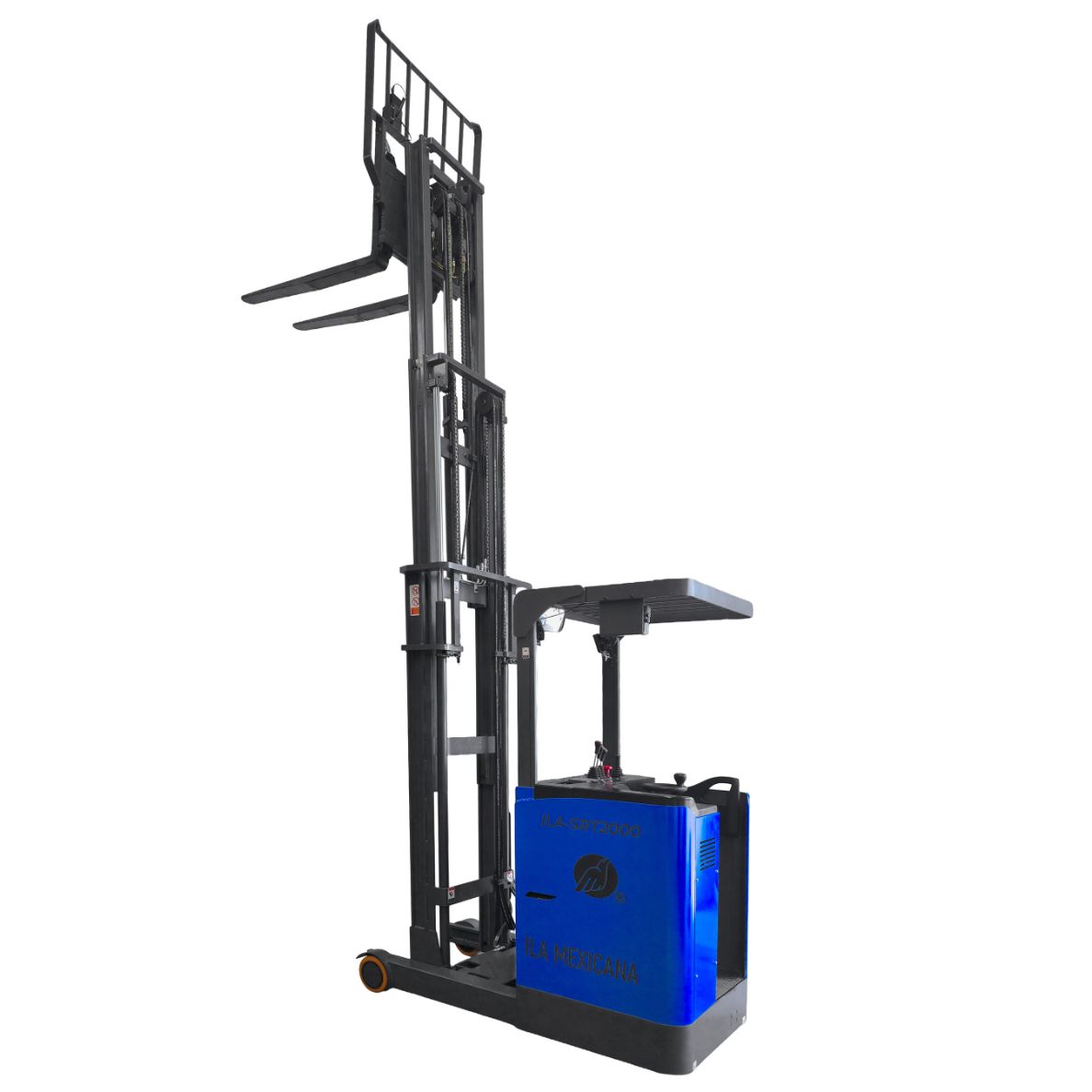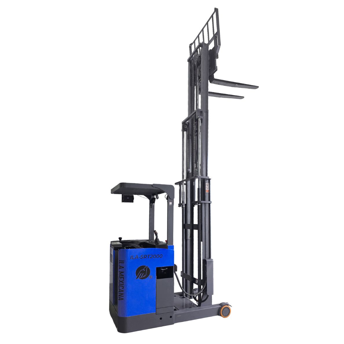 El ILA-SRT2000 es un montacargas eléctrico tipo reach truck, especialmente diseñado para almacenes con racks altos y pasillos estrechos. Con una capacidad de carga de 2 toneladas y elevación de hasta 5.5 metros, permite manipular pallets en altura con precisión y seguridad, optimizando cada movimiento dentro del almacén.