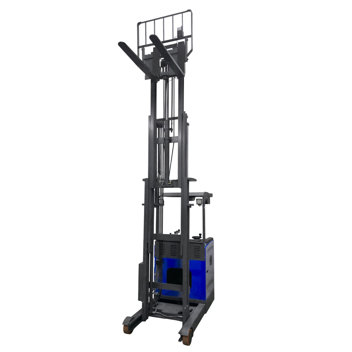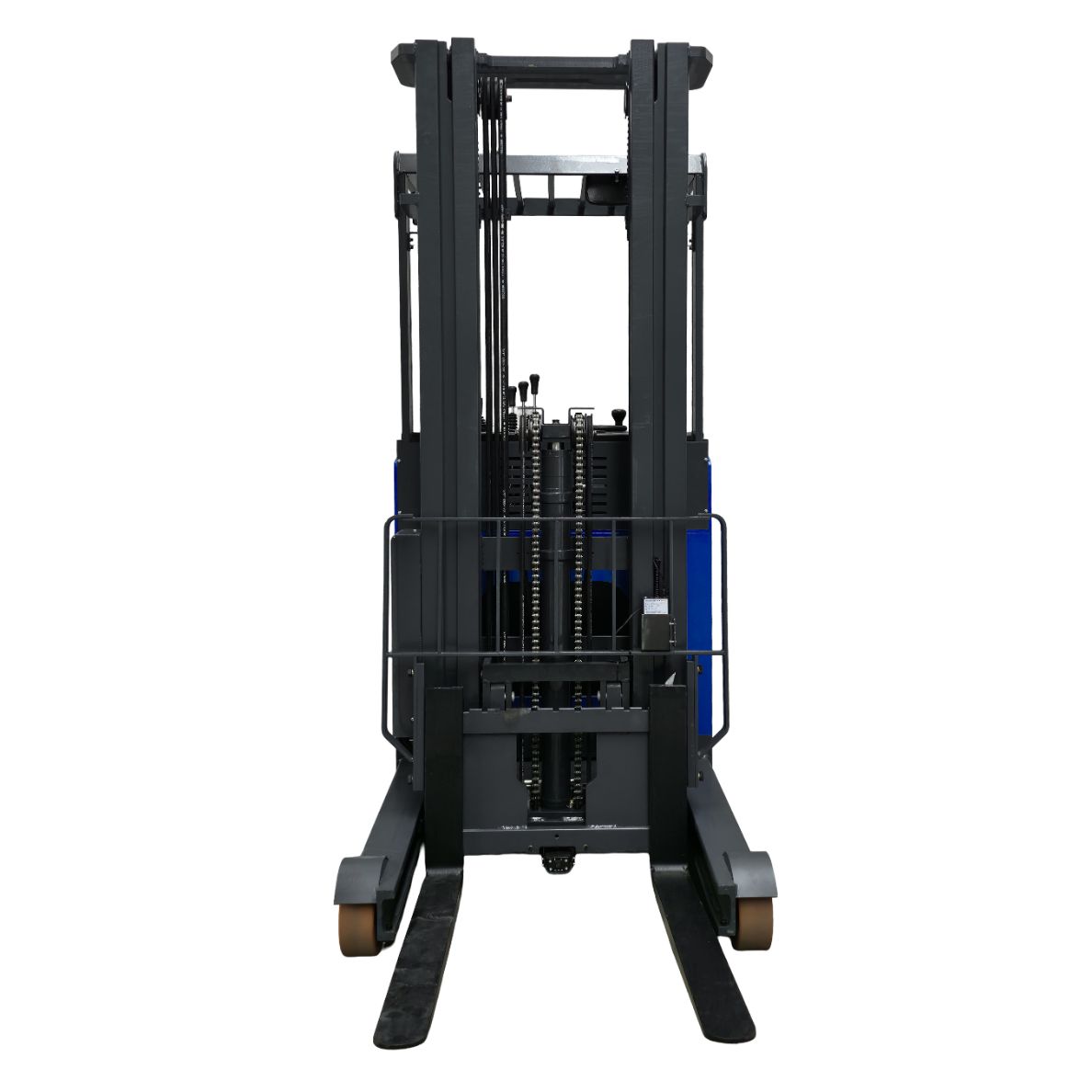 Su sistema reach truck permite extender el mástil hacia adelante y hacia arriba, logrando alcanzar racks en pasillos reducidos sin necesidad de mover el cuerpo principal del equipo. Esto significa que el operador puede colocar o recoger pallets en altura con máxima eficiencia, incluso en espacios donde un montacargas convencional no podría maniobrar.